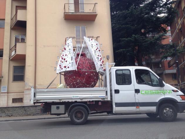VITERBO – L'ultimo smontaggio di Fiore del Cielo. Sul sagrato della basilica di Santa Rosa è in corso lo smontaggio della Macchina creata da Arturo Vittori. I vari pezzi - grazie all'aiuto delle gru - vengono adagiati sui camion che porteranno in un capannone il ''Campanile che cammina''. La zona del sagrato è transennata e possono avere accesso solo gli operai.
