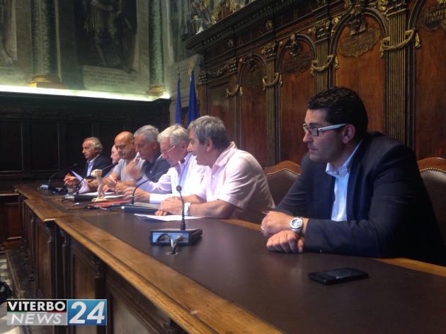 VITERBO - Dopo la trasferta romana, la consueta conferenza stampa di presentazione del Trasporto della Macchina di Santa Rosa torna a Palazzo dei Priori. Tutti de 'n sentimento, ancora di più dopo l’annuncio della partecipazione della nuova Macchina all’Expo 2015. Presenti gli assemblatori di Fiore del Cielo Vincenzo Fiorillo e Contaldo Cesarini, il capo facchino Sandro Rossi, il presidente del Sodalizio Massimo Mecarini, il sindaco di Viterbo Leonardo Michelini, l’assessore alla Cultura Tonino Delli Iaconi, il presidente della Provincia Marcello Meroi e infine l’assessore allo Sviluppo economico Giacomo Barelli.