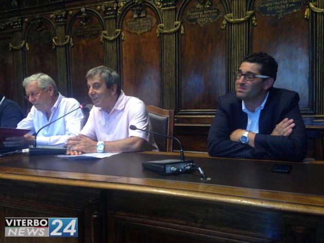 VITERBO - Dopo la trasferta romana, la consueta conferenza stampa di presentazione del Trasporto della Macchina di Santa Rosa torna a Palazzo dei Priori. Tutti de 'n sentimento, ancora di più dopo l’annuncio della partecipazione della nuova Macchina all’Expo 2015. Presenti gli assemblatori di Fiore del Cielo Vincenzo Fiorillo e Contaldo Cesarini, il capo facchino Sandro Rossi, il presidente del Sodalizio Massimo Mecarini, il sindaco di Viterbo Leonardo Michelini, l’assessore alla Cultura Tonino Delli Iaconi, il presidente della Provincia Marcello Meroi e infine l’assessore allo Sviluppo economico Giacomo Barelli.
