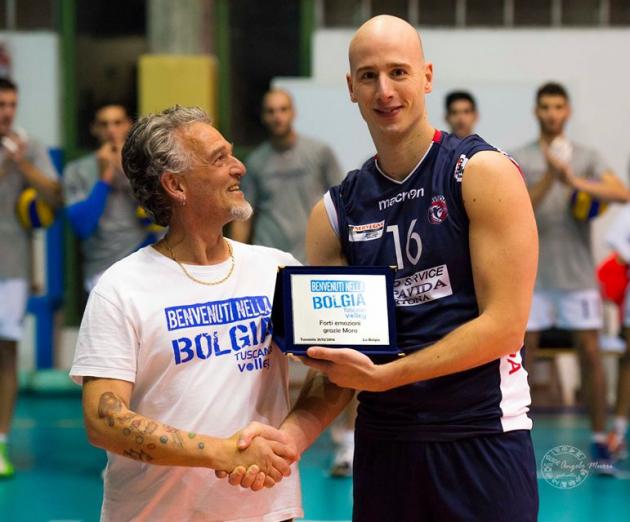 Il pomeriggio inizia in un clima festoso sugli spalti, quando una rappresentanza dei tifosi della Bolgia consegna una targa ricordo all'ex Daniele Moretti, come riconoscimento per il contributo dato la scorsa stagione al Tuscania Volley per la promozione in serie A2.