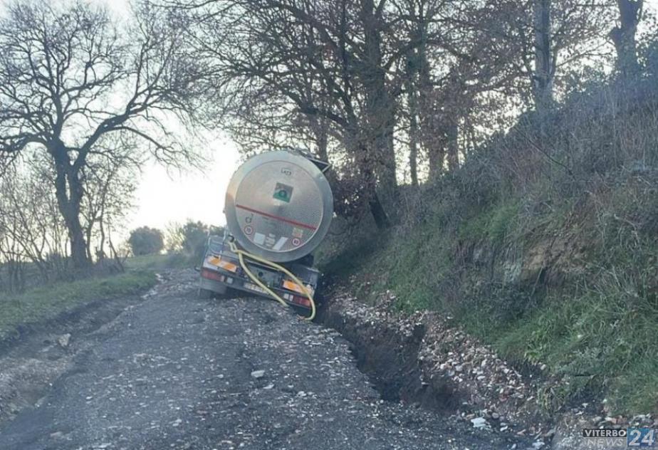 VITERBO – Paura nel pomeriggio di oggi, domenica 15 febbraio, in zona Ferento, nei pressi di Grotte Santo Stefano, dove un’autocisterna è rimasta incagliata lungo il bordo di una strada di campagna.