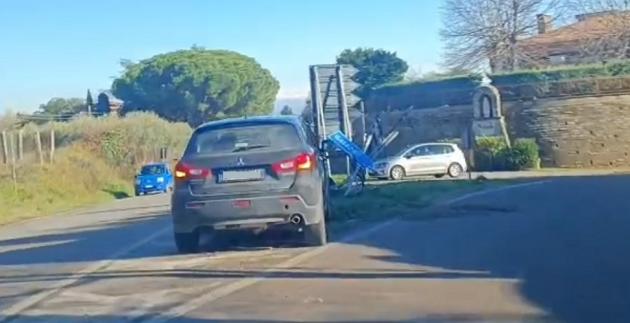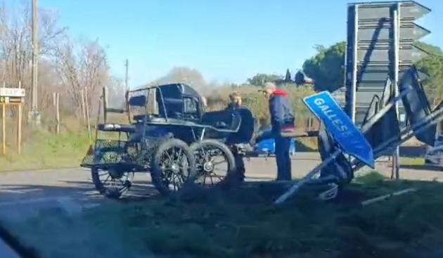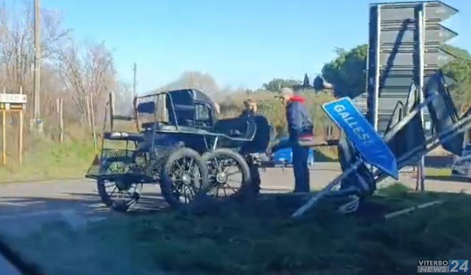 Un'antica carrozza guidata da un uomo del posto si è scontrata con la segnaletica stradale in prossimità del bivio.