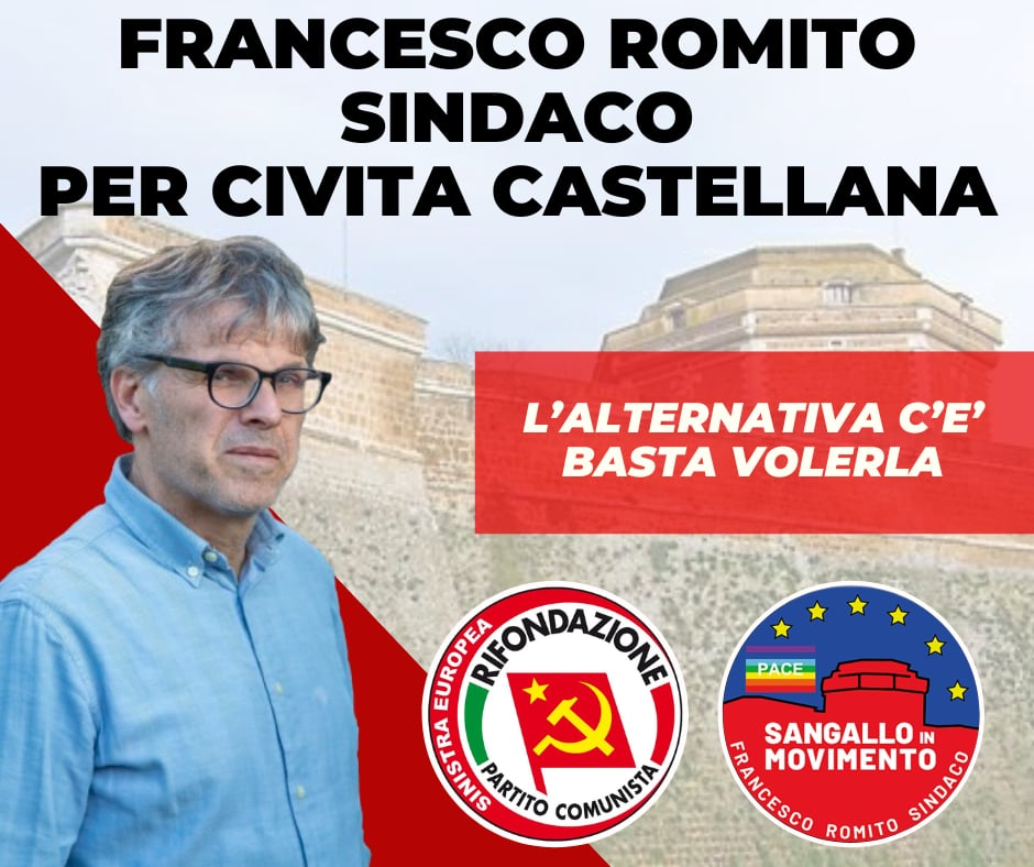 CIVITA CASTELLANA – In vista dell'appuntamento elettorale del 24 e 25 maggio, la sinistra civitonica si compatta attorno alla figura di Francesco Romito. Con lo slogan 'Per Civita Castellana', Romito scende in campo alla guida di una coalizione che punta sui temi della giustizia sociale, della pace e del territorio, sostenuto da due formazioni dalla chiara identità politica: la lista civica 'Sangallo in Movimento' e il Partito di Rifondazione Comunista.
