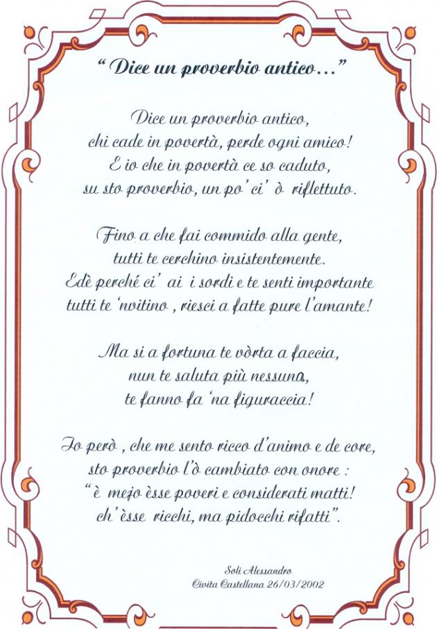 I proverbi non sbagliano mai. Essi sono la saggezza dei popoli, perché nascono dalla quotidianità e dall’ esperienza vissuta sì, in prima persona, ma che il trascorrere del tempo trasforma sempre in stile di vita e viatico da seguire. A tal proposito oggi Vi propongo questa mia composizione (come vedete da…incorniciare) “Dice un proverbio antico“.
