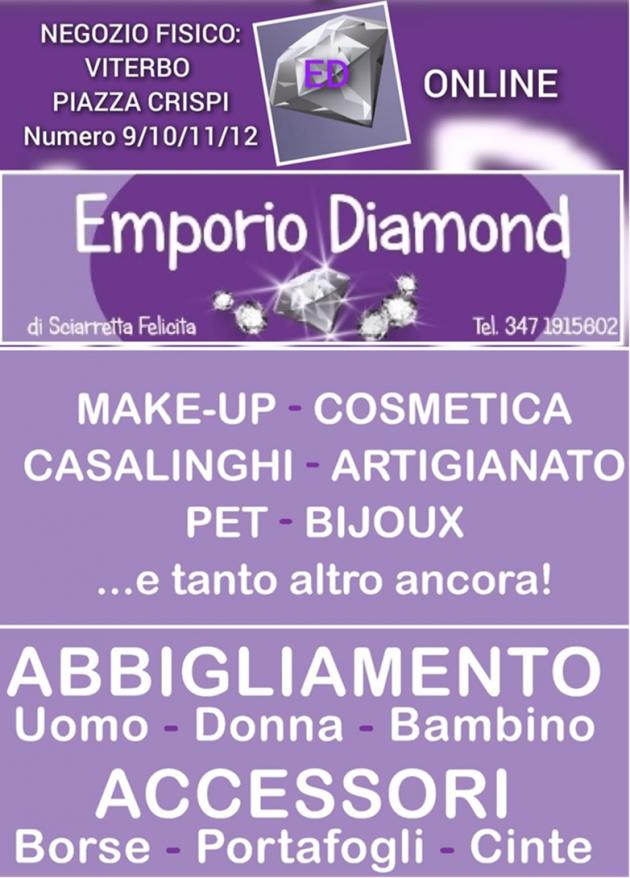 Emporio Diamond si trova nel cuore di Viterbo, a Piazza Crispi n° 9/10/11/12. Quattro vetrine e due negozi dove si può trovare di tutto, dall’abbigliamento per uomo, donna e bambino, agli accessori come borse, portafogli e cinte, make-up, cosmetica, bigiotteria, artigianato, bomboniere, casalinghi, lampade e lampadari, pet e tanto altro. Prodotti di qualità a prezzi stock!
