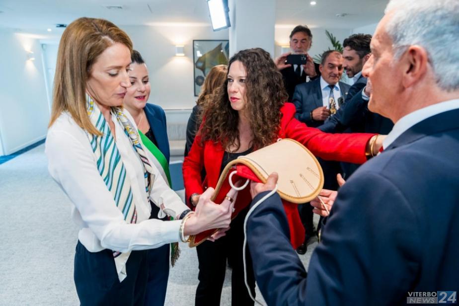 VITERBO - Il presidente del Sodalizio dei Facchini, Massimo Mecarini, e il capo Facchino Luigi Aspromonte, si sono recati ieri accompagnati dalla vicepresidente del Parlamento europeo, Antonella Sberna, dalla presidente del Parlamento europeo Roberta Metsola, dando vita a un momento di alto valore simbolico e istituzionale. Nell'occasione è stato donato il tradizionale ciuffo dei Facchini, simbolo del Trasporto della Macchina di Santa Rosa, insieme all'invito ufficiale a partecipare alla prossima celebrazione a Viterbo.