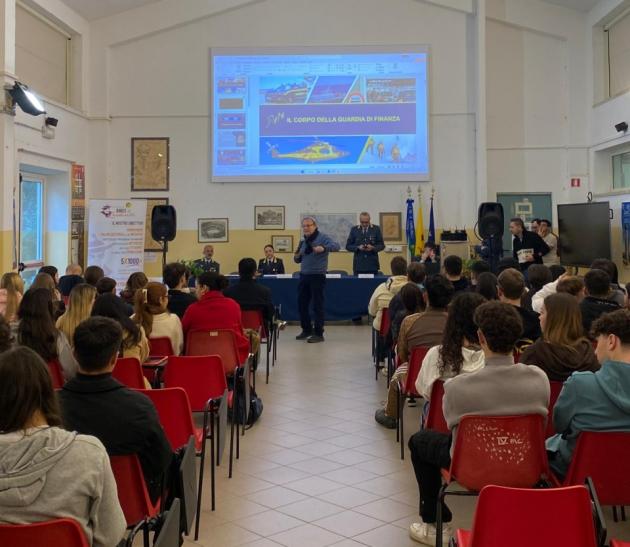 TARQUINIA - Un interessante incontro si è svolto nella mattinata di giovedì presso l’Aula Magna dell’ISS V. Cardarelli con le tutte le classi V dell’istituto tecnici e licei, coordinato dal Prof. Franco Capoccia docente di economia, indirizzo di amministrazione, finanza e marketing in collaborazione con il Capitano Pierluigi Licchetta comandante della Compagnia della Guardia di Finanza di Tarquinia e coadiuvato dall’Avv Paolo Pirani, penalista e il Dott. Sergio Belsanti medico-psichiatra operante al SerD( Servizio Dipendenze)dell’Ospedale di Tarquinia. Una lezione ad ampio spettro con interventi e filmati che hanno reso gli argomenti trattati di più facile comprensione catturando il vivo interesse degli studenti, circa 160, che si sono raccolti nell’Aula Magna per ascoltare i relatori.