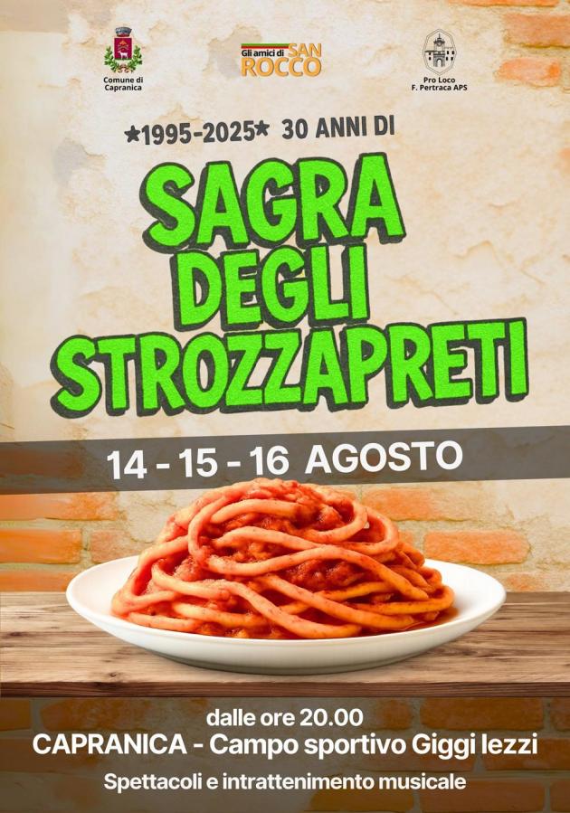 CAPRANICA - Capranica si prepara a celebrare il gusto e le tradizioni con la tanto attesa Sagra degli Strozzapreti, che si terrà dal 14 al 16 agosto 2025 nel cuore della Tuscia viterbese. Organizzata con passione dagli amici di San Rocco, questa manifestazione promette tre serate all’insegna della buona cucina, della musica dal vivo e del folklore, ideali per tutta la famiglia.