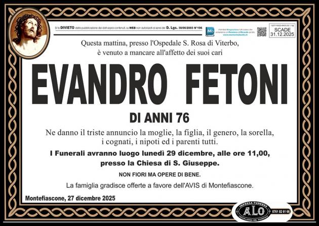 La cerimonia funebre è fissata per lunedì 29 dicembre alle ore 11 nella chiesa di San Giuseppe di Montefiascone, dove familiari, amici e cittadini potranno dare l’ultimo saluto a Fetoni.