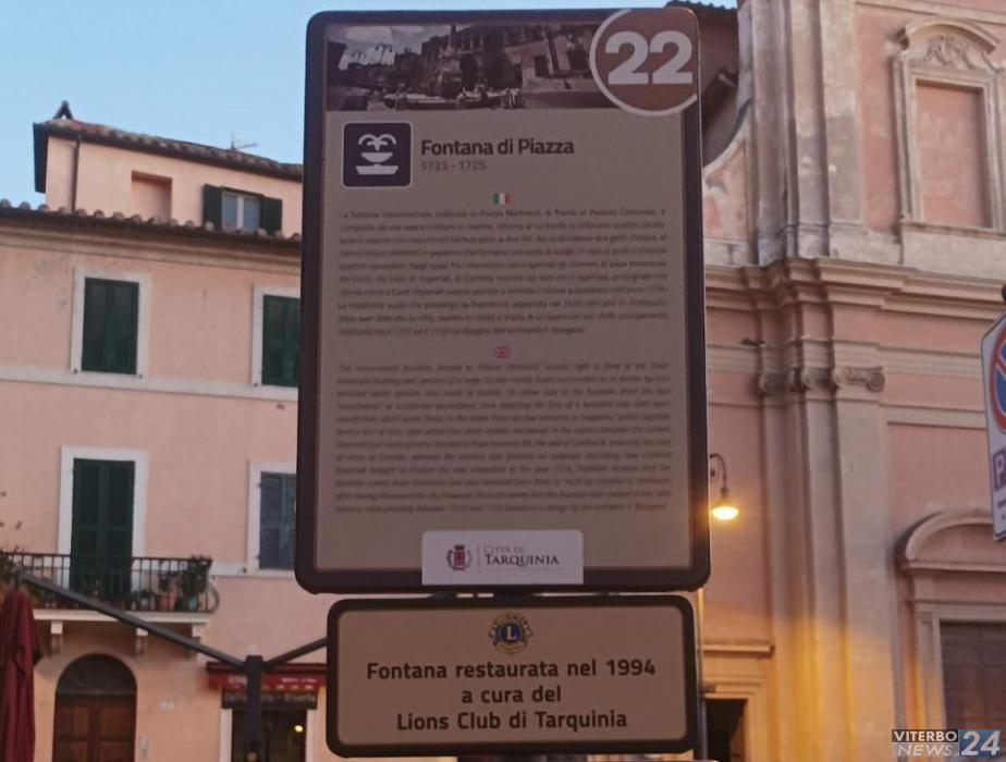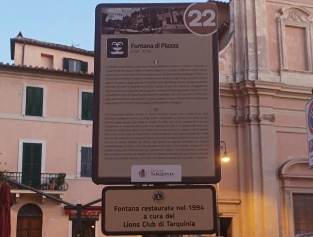 TARQUINIA – Il Lions Club di Tarquinia ha riposizionato una nuova targa commemorativa che ricorda l'importante restauro conservativo della fontana monumentale di piazza Giacomo Matteotti, realizzato nel 1994 dal Club sotto la presidenza di Giuseppe Tini. 'All'epoca del restauro – ricorda la presidente del Lions Club Tarquinia, Roberta Ranucci –, fu organizzata una bellissima cerimonia inaugurale, in collaborazione con l'allora sindaco Maurizio Conversini, alla presenza di numerosi cittadini e rappresentanti delle istituzioni.