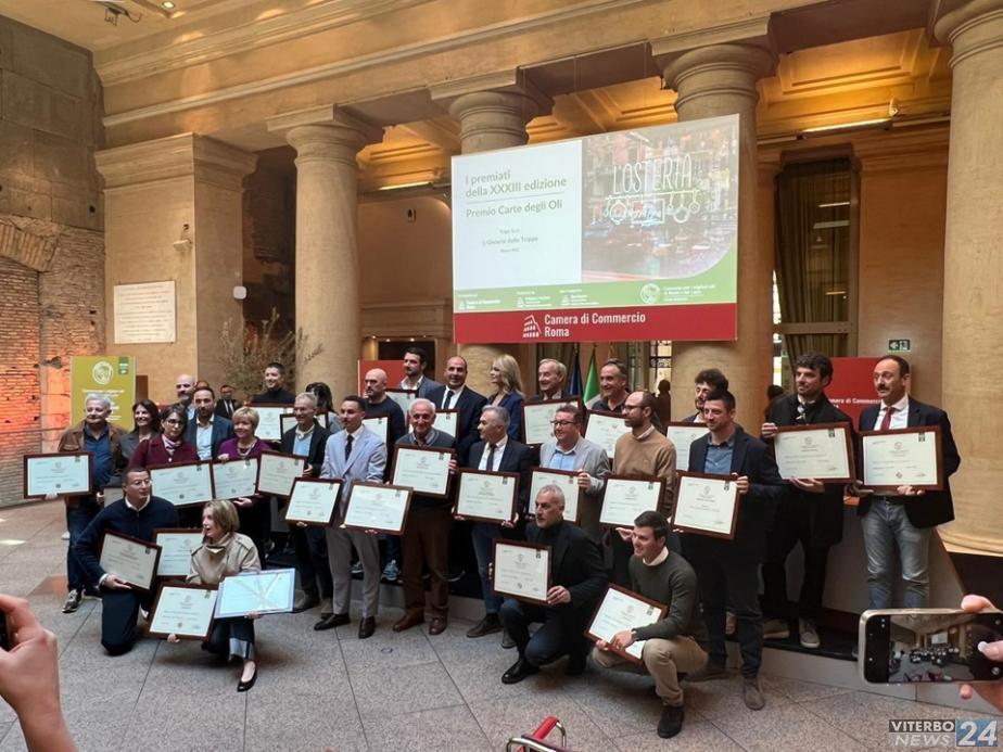 VITERBO – La Sala del Tempio di Vibia Sabina e Adriano della Camera di Commercio di Roma ha ospitato oggi la cerimonia ufficiale di premiazione del 'Premio Roma Evo - XXXIII Concorso regionale per i migliori olii extravergine di oliva del Lazio', il concorso regionale che celebra l'eccellenza della produzione olivicola del Lazio. Il Concorso è promosso dalla Camera di Commercio di Roma, attraverso la propria Azienda Speciale Sviluppo e Territorio, per lo sviluppo e la crescita di Roma e della regione Lazio, con il supporto tecnico-scientifico di Agro Camera, in collaborazione con la Regione Lazio, le associazioni di categoria di settore e le altre Camere di Commercio della regione tra cui quella di Rieti Viterbo.