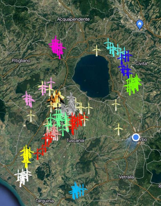 Degli amministratori locali, oltre alla sindaca di Viterbo Chiara Frontini, ci sono tutti i sindaci dei territori a nord della provincia della Tuscia, a cominciare dal sindaco di Bolsena. Anche il Bio distretto della via Amerina e delle Forre ha aderito alla lettera, e lo comunica attraverso i social network: 'Le sette turbine previste superano i 200 metri di altezza, l’equivalente di grattacieli di settanta piani collocati non in un’area industriale, ma a ridosso di borghi storici, lungo crinali agricoli, siti archeologici, città d’arte e paesaggi rurali rimasti intatti per secoli. Si trovano inoltre entro un raggio di 500 metri dalle abitazioni delle persone. Il bilancio ambientale è altrettanto allarmante: solo per le fondamenta delle sette turbine sono previste oltre 15.000 tonnellate di cemento, più di 600 tonnellate di acciaio e quasi 6.000 tonnellate di sabbia'.