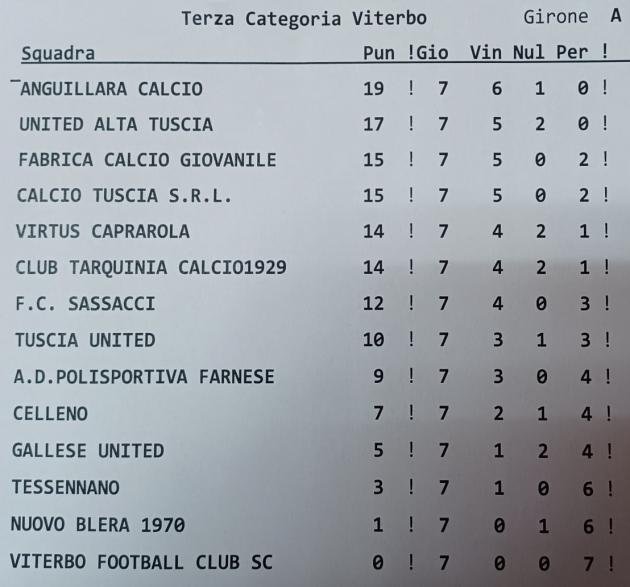 In Terza, si riprende con l'8° giornata del girone d'andata, in testa alla classifica c’è United Alta Tuscia con 17 punti, anche se il campionato è ancora apertissimo e imprevedibile. Da sabato si potrà capire la situazione attuale delle squadre, con possibili colpi di scena dovuti alla perdita di giocatori non possessori di Green Pass o magari al rafforzamento di qualcuna con il tesseramento di nuovi calciatori in rosa. Il calendario di Terza Categoria riprenderà con: