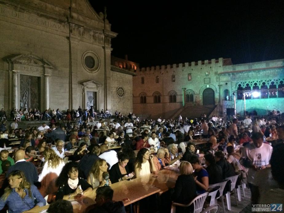 VITERBO (Fla. Lud.) – Un’inaugurazione col botto. La prima delle quattro sere dedicate alle cene organizzate in piazza San Lorenzo dai facchini di Santa Rosa ha registrato un vero boom di presenze. In tanti non hanno voluto mancare al primo degli ormai tradizionali appuntamenti che precedono il Trasporto del 3 settembre e, nonostante il tempo poco promettente, hanno gustato i piatti tipici preparati dalle sapienti mani delle donne del Circolo Giulio Selvaggini di Pianoscarano all’ombra di palazzo papale, contribuendo così alla raccolta fondi da destinare in beneficenza.