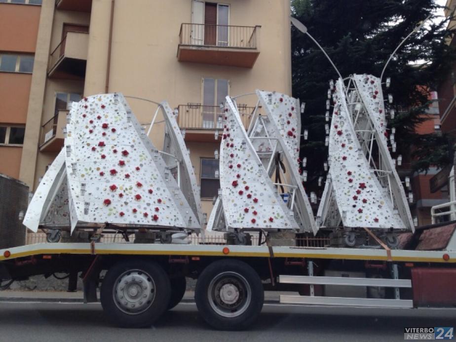 VITERBO – L'ultimo smontaggio di Fiore del Cielo. Sul sagrato della basilica di Santa Rosa è in corso lo smontaggio della Macchina creata da Arturo Vittori. I vari pezzi - grazie all'aiuto delle gru - vengono adagiati sui camion che porteranno in un capannone il ''Campanile che cammina''. La zona del sagrato è transennata e possono avere accesso solo gli operai.