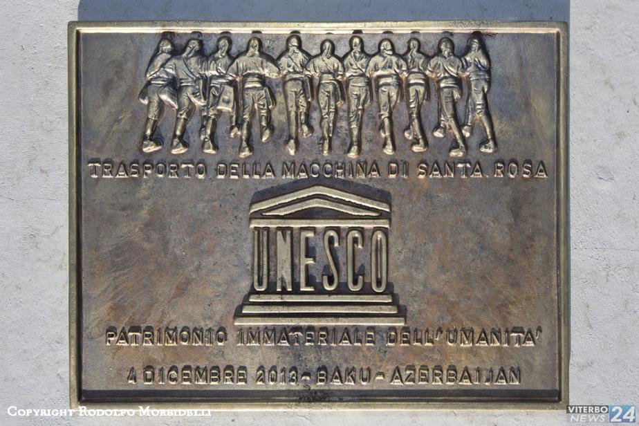 L’idea di collocare le targhe lungo il percorso della Macchina è venuta in mente al Comune di Viterbo Sodalizio che, in questo modo, ha voluto ricordare e far ricordare a chi passeggerà tra le vie, che il Trasporto ha avuto l’importante nomina a patrimonio dell’Unesco. Il bassorilievo della piastra commemorativa è stata realizzata dal maestro Michele Telari, mentre il simbolo dell’Unesco, che rappresenta un tempio, è stato realizzato in vettoriale dal designer Luca Occhialini. La realizzazione grafica è stata affidata al fotografo del Sodalzio Rodolfo Morbidelli.