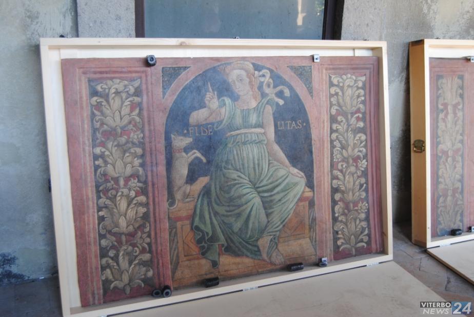 VITERBO – Torneranno questa mattina a Viterbo i quattro affreschi cinquecenteschi raffiguranti le virtù profane, strappati dalle pareti di palazzo Spreca, nel centro storico del capoluogo.