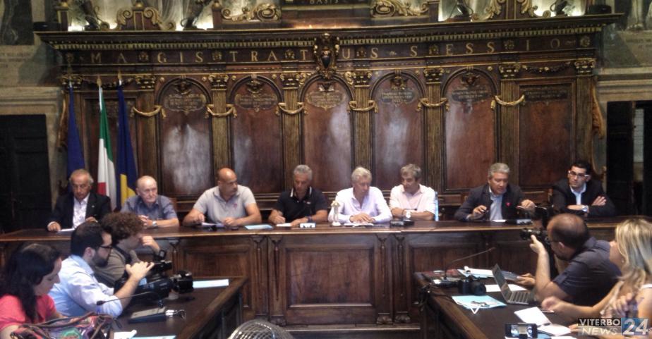 VITERBO - Dopo la trasferta romana, la consueta conferenza stampa di presentazione del Trasporto della Macchina di Santa Rosa torna a Palazzo dei Priori. Tutti de 'n sentimento, ancora di più dopo l’annuncio della partecipazione della nuova Macchina all’Expo 2015. Presenti gli assemblatori di Fiore del Cielo Vincenzo Fiorillo e Contaldo Cesarini, il capo facchino Sandro Rossi, il presidente del Sodalizio Massimo Mecarini, il sindaco di Viterbo Leonardo Michelini, l’assessore alla Cultura Tonino Delli Iaconi, il presidente della Provincia Marcello Meroi e infine l’assessore allo Sviluppo economico Giacomo Barelli.