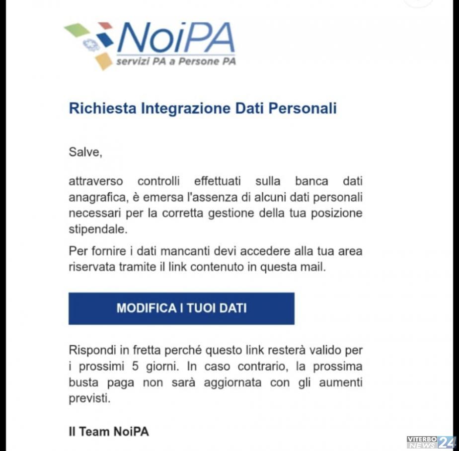 VITERBO - La truffa del 'phishing' arriva ancora una volta via e-mail: inviate richieste di 'integrazione dati' da una falsa piattaforma NoiPa, il sistema per i dipendenti della Pubblica Amministrazione.