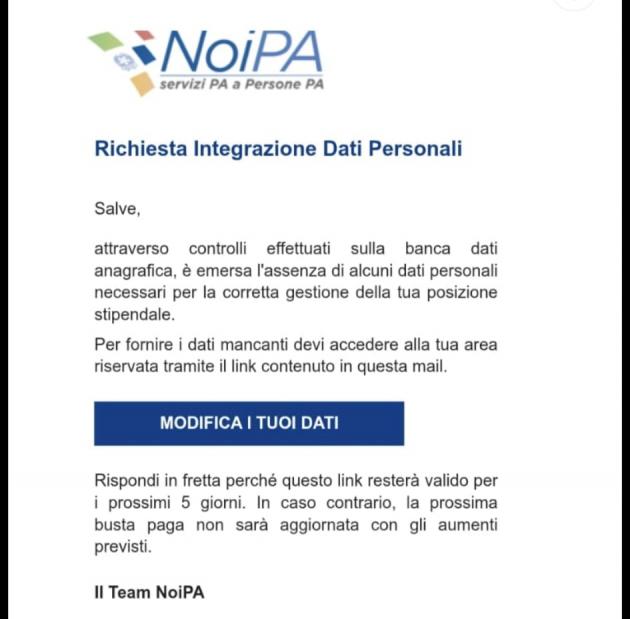 'Attraverso controlli effettuati sulla banca dati anagrafica, è emersa l'assenza di alcuni dati personali necessari per la corretta gestione della tua posizione stipendiale' si legge nella comunicazione incriminata 'rispondi in fretta perché questo link resterà valido per i prossimi 5 giorni. In caso contrario, la prossima busta paga non sarà aggiornata con gli aumenti previsti'.