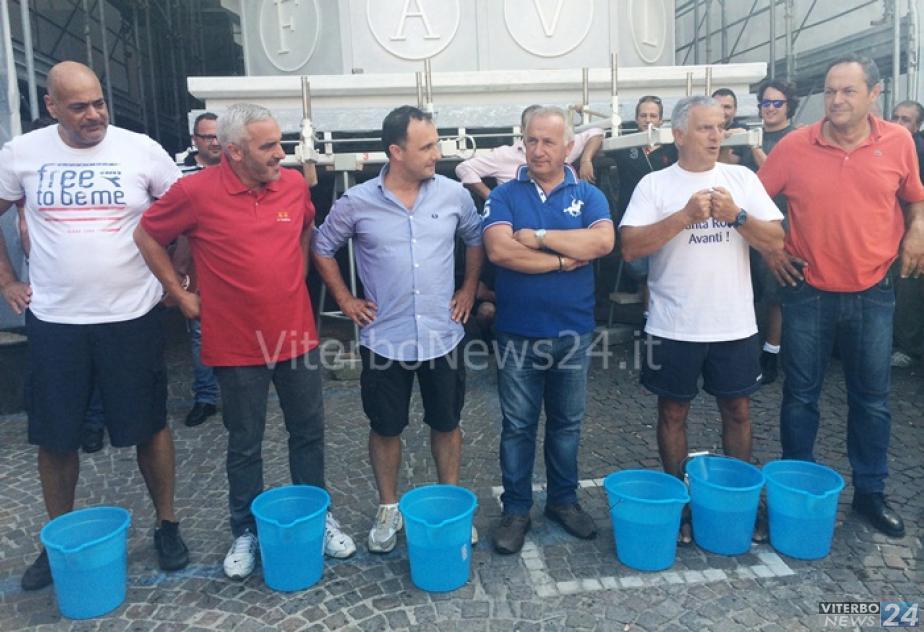 Poi il tanto atteso momento dell’Ice Bucket Challenge. Come promesso dal presidente del Sodalizio Mecarini e dopo aver donato a nome di tutti i facchini di Santa Rosa 500 euro all’Aisla, associazione italiana sclerosi laterale amiotrofica, la doccia di acqua gelata. Presidente, capofacchino, vice presidente Luigi Aspromonte, il facchino Luciano Tola e la famiglia Fiorillo, Vincenzo, Mirco e Stefano, assemblatori della Macchina, hanno dato il via alla doccia a fin di bene con acqua e ghiaccio. Ma non prima di aver fatto le nomination: sindaco di Viterbo Leonardo Michelini, presidente della Provincia Marcello Meoi, assessori Giacomo Barelli, Alvaro Ricci, tutti i membri del Consiglio comunale, stampa viterbese e niente di meno che il calciatore Leonardo Bonucci sono avvertiti. Coraggiosa la consigliera Maria Rita De Alexandris che ha raccolto subito la nomination e sotto lo sguardo di facchini e curiosi ha fatto il bagno. Sciolte poi le righe a piazza San Sisto, ora si attende davvero il 3 settembre, e manca davvero pochissimo.