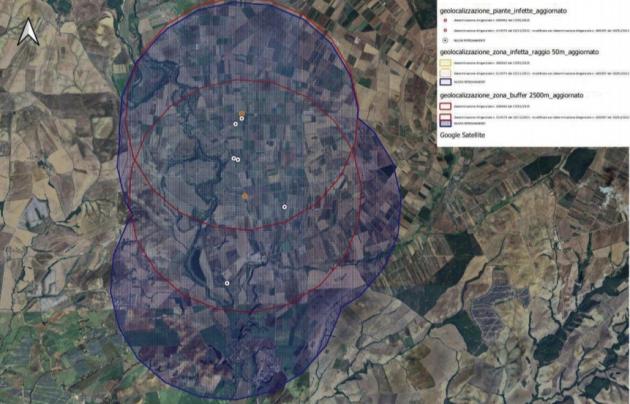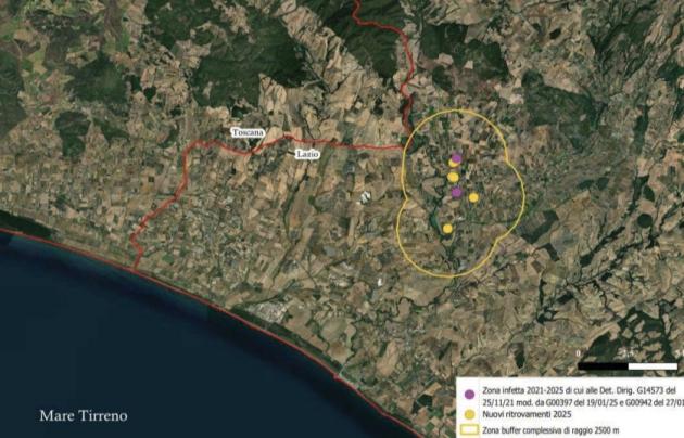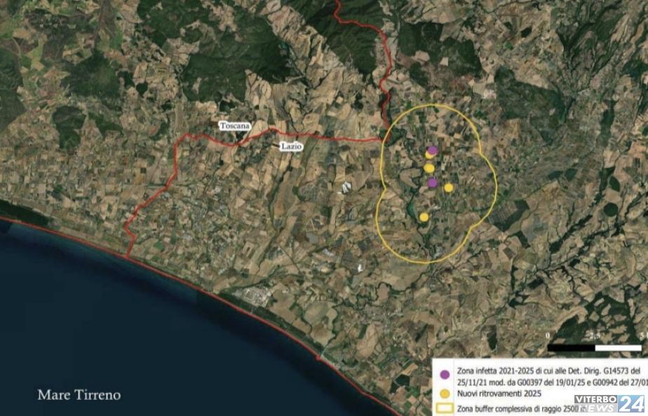 Il primo riscontro positivo risale appunto al 2021, su un mandorlo di Canino. Poi è stata la volta di Tarquinia nel 2022, con 5 rilievi di infezioni su ginestre e uno su mandorlo. Nel 2023 in uno dei due siti podsitivi di Tarquinia rilevati 7 casi su ginestra e 1 su mimosa; nel 2024 rilevata Xylella su un mandorlo a Canino, 3 ginestre, 4 mandorli e un rosmarino a Tarquinia. Nel 2025, infine, rilevati a Canino 5 casi su mandorlo, uno si Rahmnus Alaternus, e un altro caso su mandorlo; a Tarquinia, invece, due casi su Polygala Myrtifolia, 5 su mandorlo, uno su lavandula dentata, 3 su ginestra, 1 su spartium e un caso su rosmarino. Alcuni dei rilievi di elemento patogeno sono stati effettuati in piante su ciglio sttradale, alcuni in giardini e altri in campi di aziende agricole.