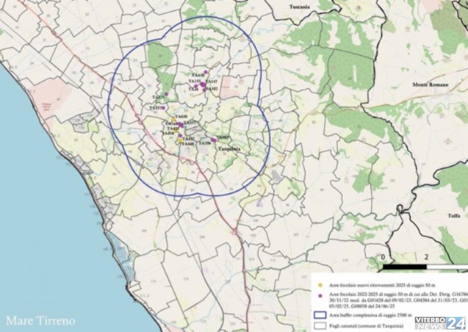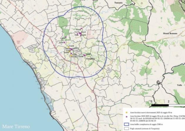 Sono 41 le piante rilevate infette, individuate in tre siti specifici: le misure imposte dalla normativa prevedono l'eradicazione delle piante infette e di quelle non infette ma sulle quali non è stata effettuata l'analisi, entro 50 metri, e una zona cuscinetto esterna.